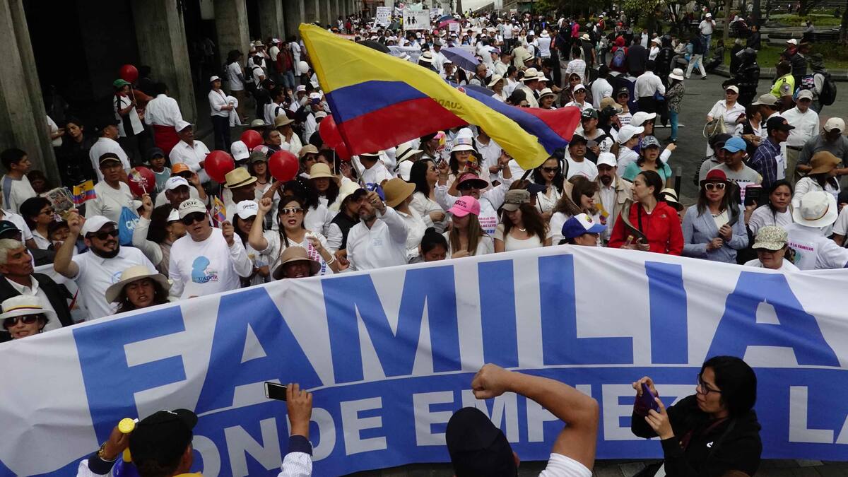 Los manifestantes expresaron su rechazo a la decisión de los jueces de la Corte Constitucional que el 12 de junio dio luz verde al matrimonio civil igualitario en Ecuador, con lo que el país se sumó a Argentina, Brasil, Colombia y Uruguay en el reconocimiento de este derecho a las minorías sexuales.