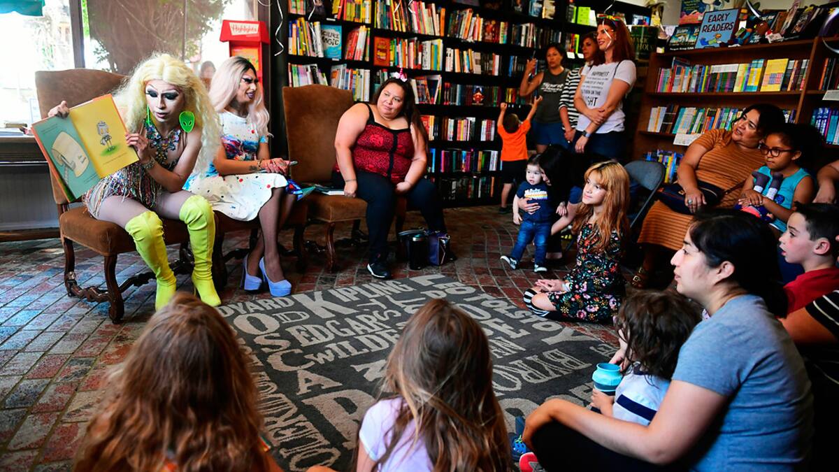 Con cabello rubio largo y luciendo leotardos de lentejuelas y vestidos de arcoíris, Athena y Scalene leen libros a unos 15 niños en una librería de Riverside, California.