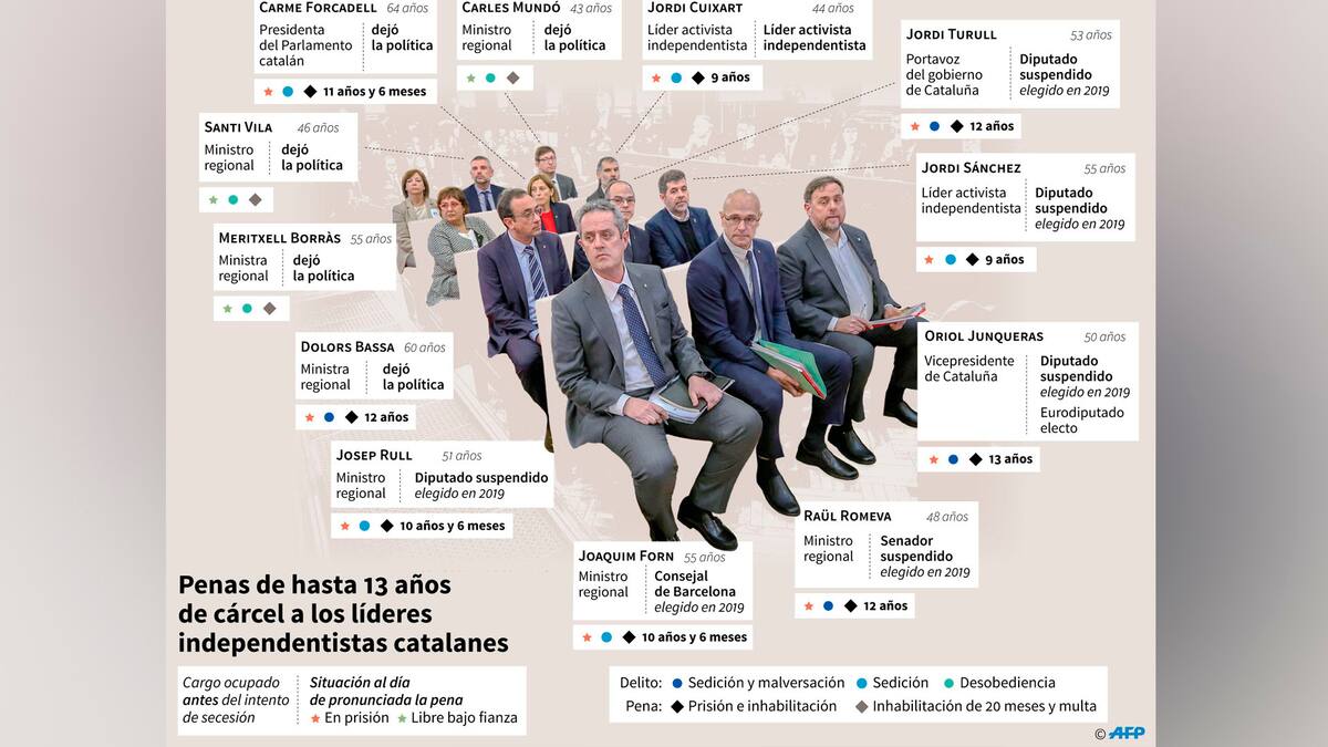Los doce fueron juzgados por haber organizado el 1 de octubre de 2017 un referéndum de autodeterminación ilegal -marcado por imágenes de violencia policial que dieron la vuelta al mundo-, y la proclamación el 27 de ese mes en el Parlamento regional de una 'República catalana' que nunca se materializó.