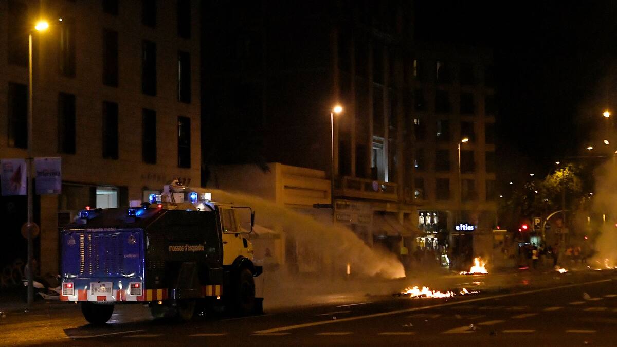 Muestra de la exacerbación de la violencia, que se prolongaba por varias horas y escalaba a un nivel mayor en esta noche de disturbios en Barcelona, la policía usó por primera vez gases lacrimógenos y un camión lanza agua para abrirse paso a través de las barricadas construidas con todo tipo de mobiliario urbano.