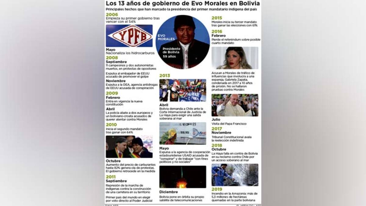 Morales, de 59 años, asumió en enero de 2006 como el primer mandatario indígena de Bolivia, en medio de una ola de victorias de signo izquierdista que atravesó la región con el cambio de milenio.