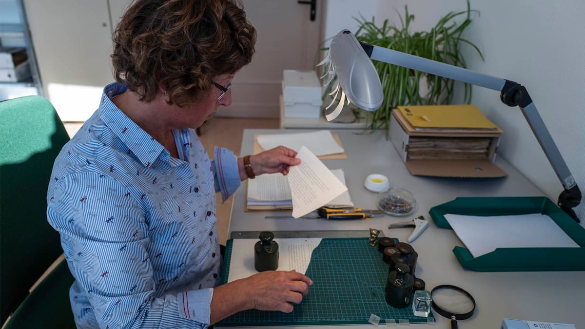 Poenisch asegura que la clave de su trabajo no es solo la paciencia, sino sobre todo su 'enorme responsabilidad'. Lo explica mientras junta trozos de papel que sujeta a cada lado con pisapapeles antes de pegarlos.
