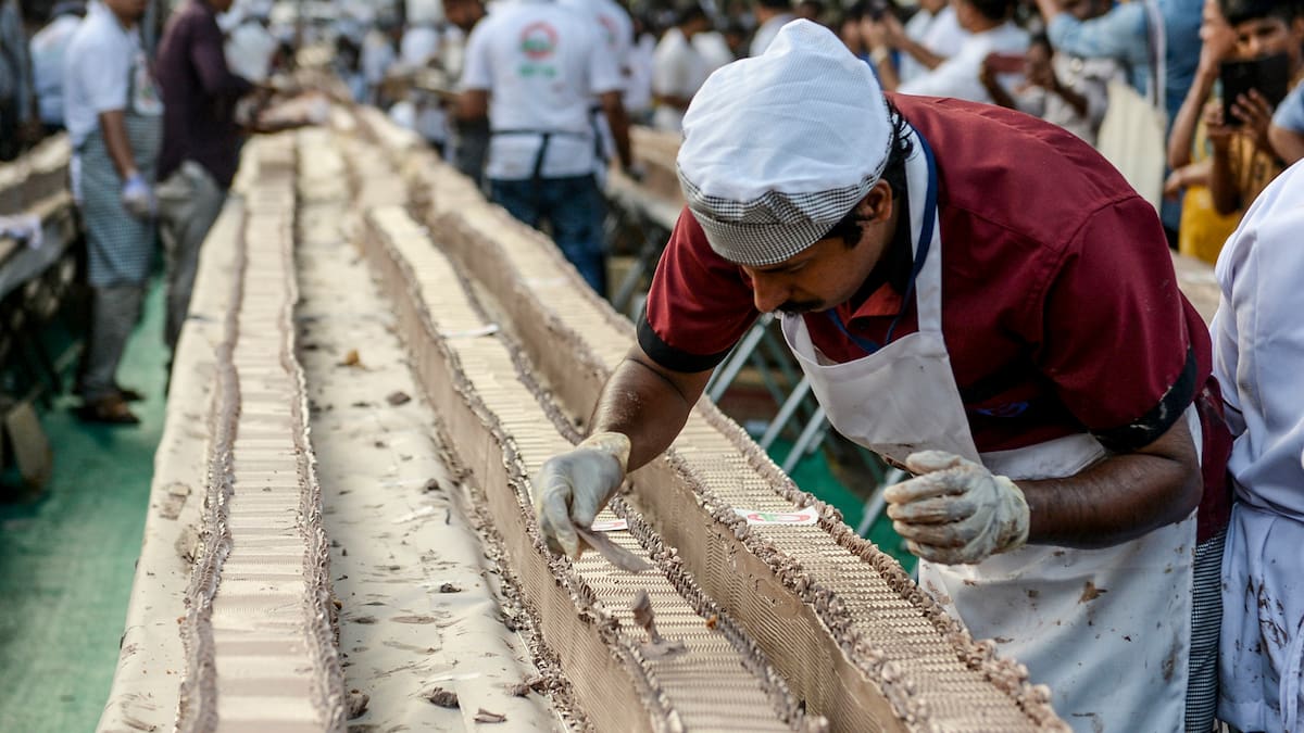 Con habilidad esparcen chocolate ganache sobre el enorme postre extendido sobre miles de mesas y escritorios, que serpentean en un recinto para festivales y las carreteras adyacentes, en la ciudad de Thrissur, en el estado costero de Kerala.