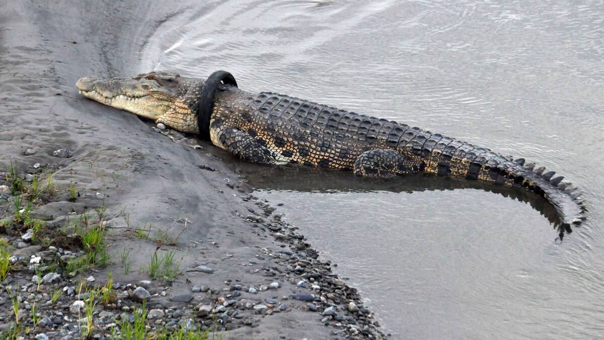 Las autoridades indonesias ofrecen una recompensa a quien pueda ayudar a un cocodrilo marino con un neumático de motocicleta atascado en el cuello. El valiente cazador de cocodrilos recibirá una suma en efectivo no especificada.
