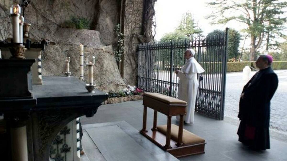 El Papa rezó el silencio el rosario frente al lugar de los jardines vaticanos donde se realizó una copia idéntica de la gruta de la aparición del santuario de Lourdes, en Francia, en una ceremonia a la que asistieron un centenar de personas, todas ellas con mascarillas y distanciadas de un metro.