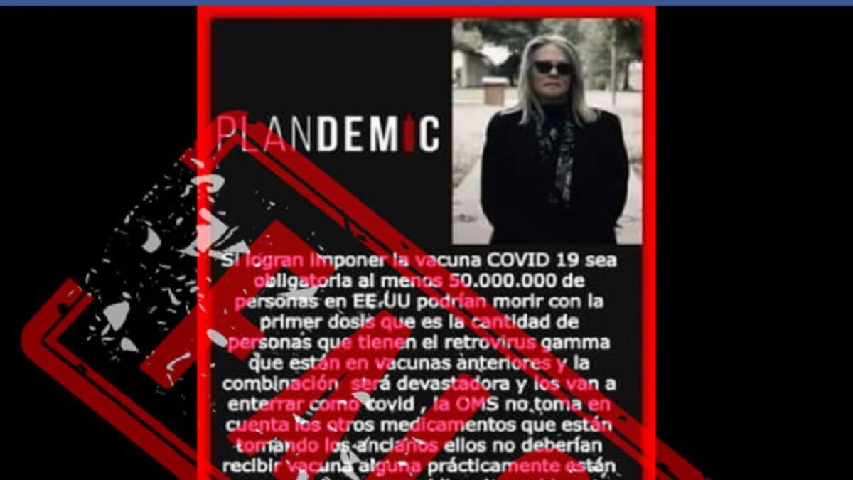 Según una imagen que circula por Facebook con el logo del ya desmentido video conspirativo ‘Plandemic’ y la foto de su principal entrevistada, la supuesta viróloga Judy Mikovits, 'si logran imponer [que] la vacuna COVID-19 sea obligatoria, al menos 50 millones de personas en Estados Unidos podrían morir con la primera dosis, que es la cantidad de personas que tienen el retrovirus gamma que está en vacunas anteriores y la combinación será devastadora'.