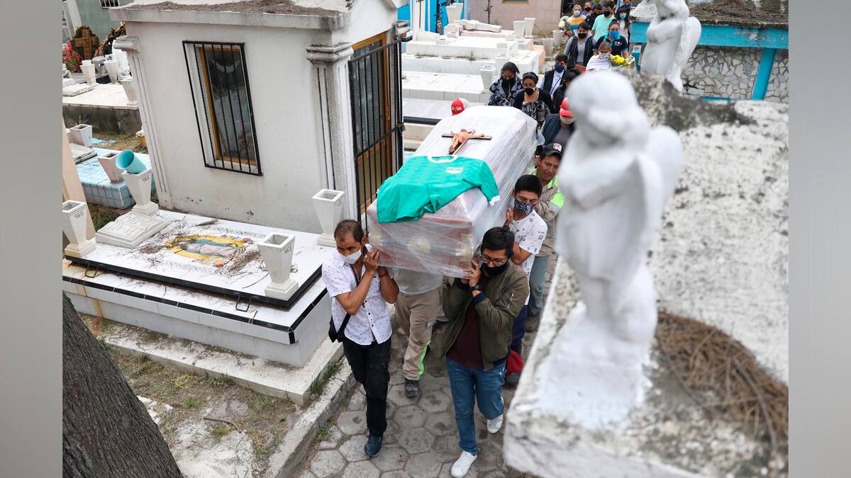 La crisis sanitaria solo se dejaba entrever por un detalle, además de los cubrebocas: el ataúd había sido recubierto de plástico en el hospital como dicta el protocolo sanitario por la pandemia para evitar que los allegados lo abran
