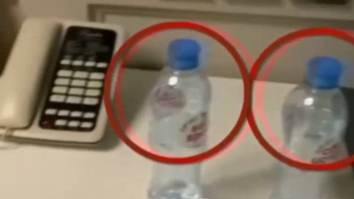 En el vídeo publicado en Instagram se ve una habitación de hotel, desordenada, en la que hay varias personas, una de ellas con las manos enguantadas que recoge en una bolsa las botellas de agua del cuarto.