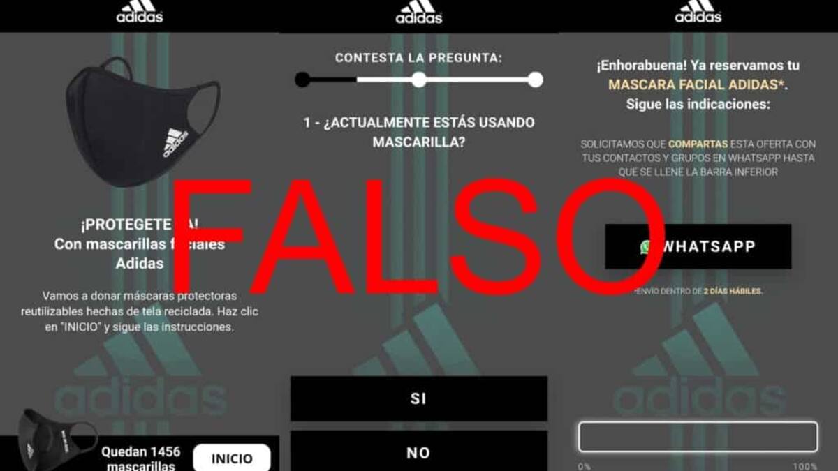 Adidas, la marca de ropa deportiva, nuevamente es víctima de desinformaciones. Una cadena que circula en WhatsApp y Facebook, invita a los que la reciben a inscribirse y participar en un sorteo de '3.100 zapatos, camisetas y máscaras [tapabocas] gratis para todos'.