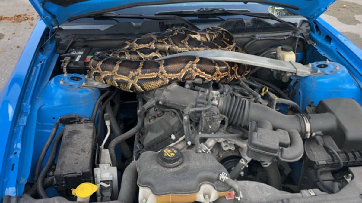 Especialistas de la Comisión de Conservación de la Fauna y la Pesca de Florida (FWC) retiraron de un auto Ford Mustang una serpiente pitón de 10 pies (3 metros) de largo que había encontrado un escondrijo junto al motor.