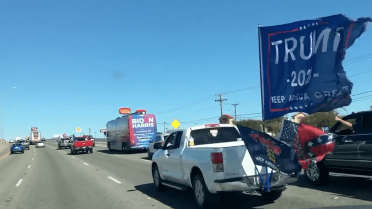 Las imágenes publicadas en las redes sociales muestran una larga fila de vehículos con banderas de Trump que persiguen al autobús identificado en su exterior como de campaña Biden-Harris mientras iba de San Antonio a Austin, bloqueándole el paso.
