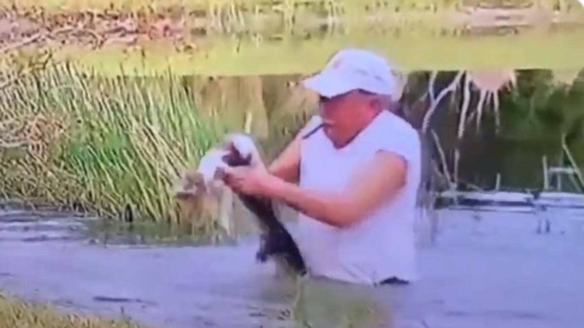 Un hombre se lanzó a un lago en Estero, en la costa oeste de Florida, a rescatar a su cachorro de tres meses de las fauces de un cocodrilo al que casi no le puede abrir las mandíbulas, según se ve en un dramático video que se hizo viral.
