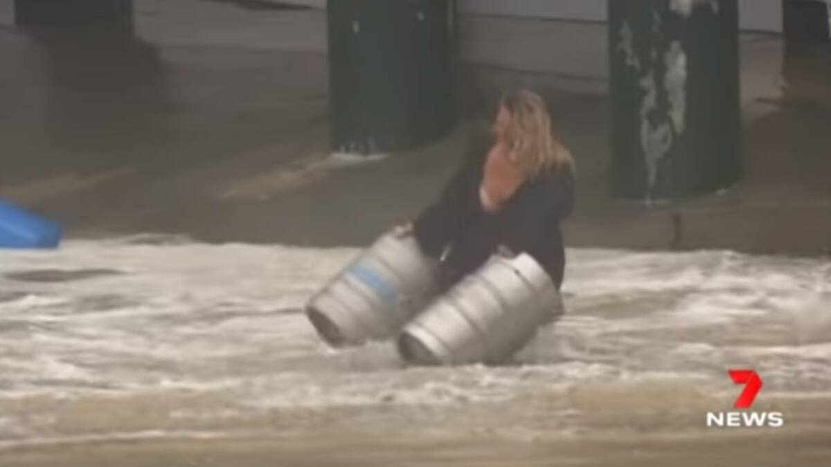 Una mujer australiana se lanzó al agua en una calle inundada luego de ver que la corriente se llevaba dos barriles de cerveza que eran de su propiedad.