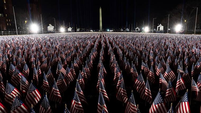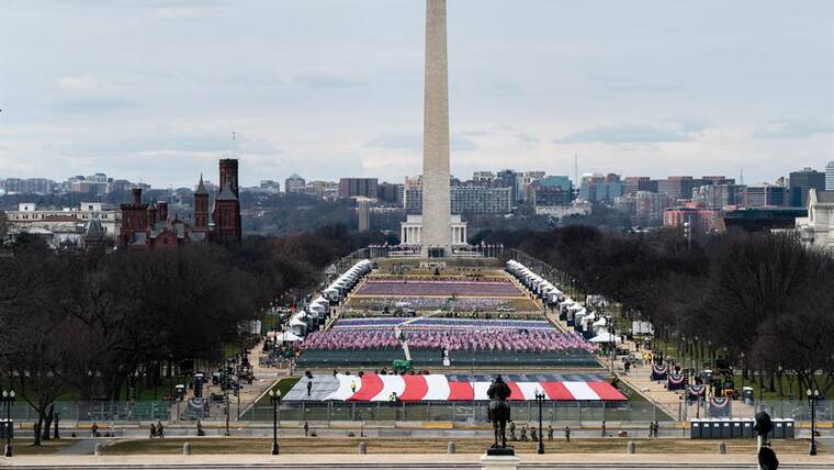 Alrededor de la Explanada Nacional o National Mall como es conocido formalmente fueron ubicadas 200.000 banderas y 56 pilares de luz que representarán a aquellos que no podrán atender al evento de manera presencial debido a las restricciones por la pandemia del coronavirus.