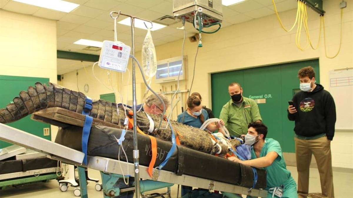 Anuket, de 10,5 pies (3,2 metros) de largo y 341 libras (154 kilos) de peso, se recupera de la intervención realizada en la Facultad de Veterinaria de la Universidad de Florida en el Alligator Farm Zoological Park de la primera ciudad fundada por europeos en lo que hoy es Estados Unidos.