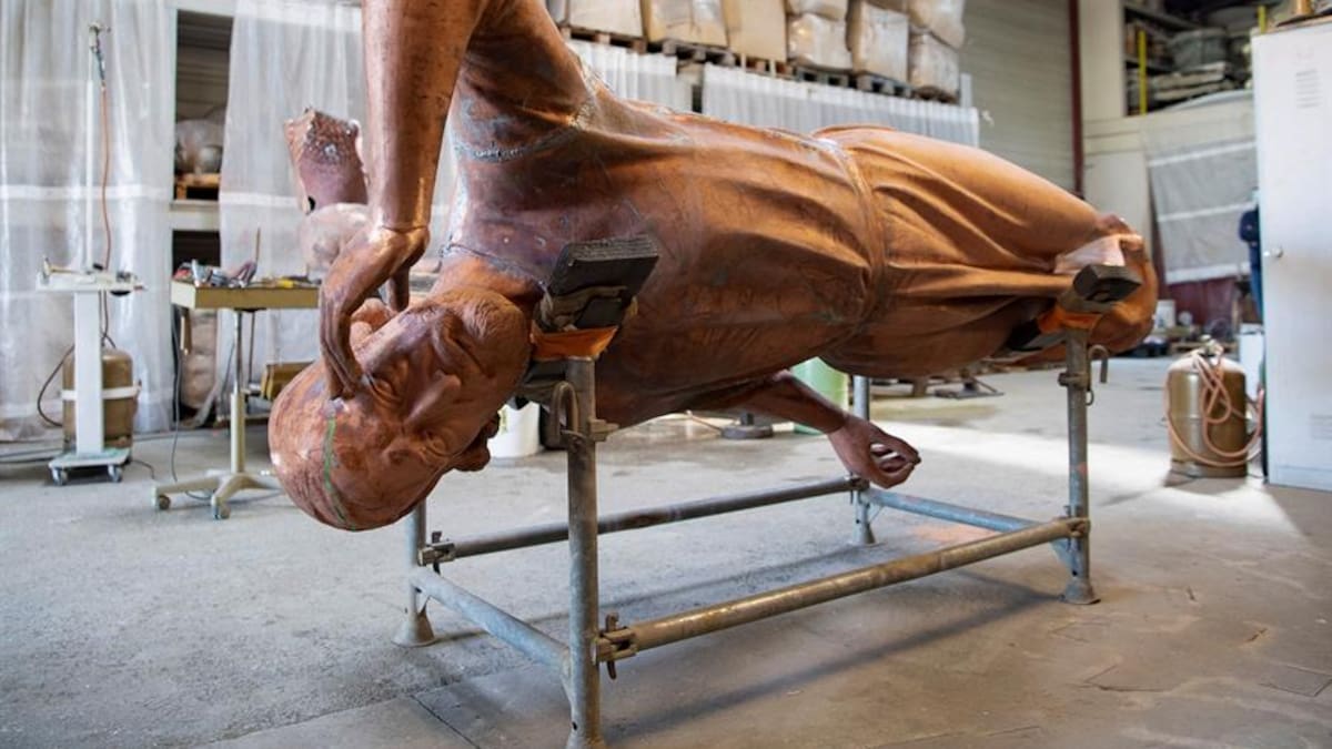 Recostada en una estructura metálica, la estatua está aún medio abierta y luce en su interior en una armadura metálica nueva y lustrosa.