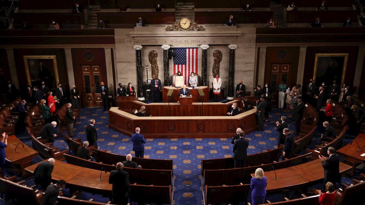 Es la primera vez que un presidente de EE. UU. se dirige a las dos cámaras del Congreso con dos mujeres tras él. Harris y Pelosi son la segunda y tercera en la línea de sucesión, respectivamente.