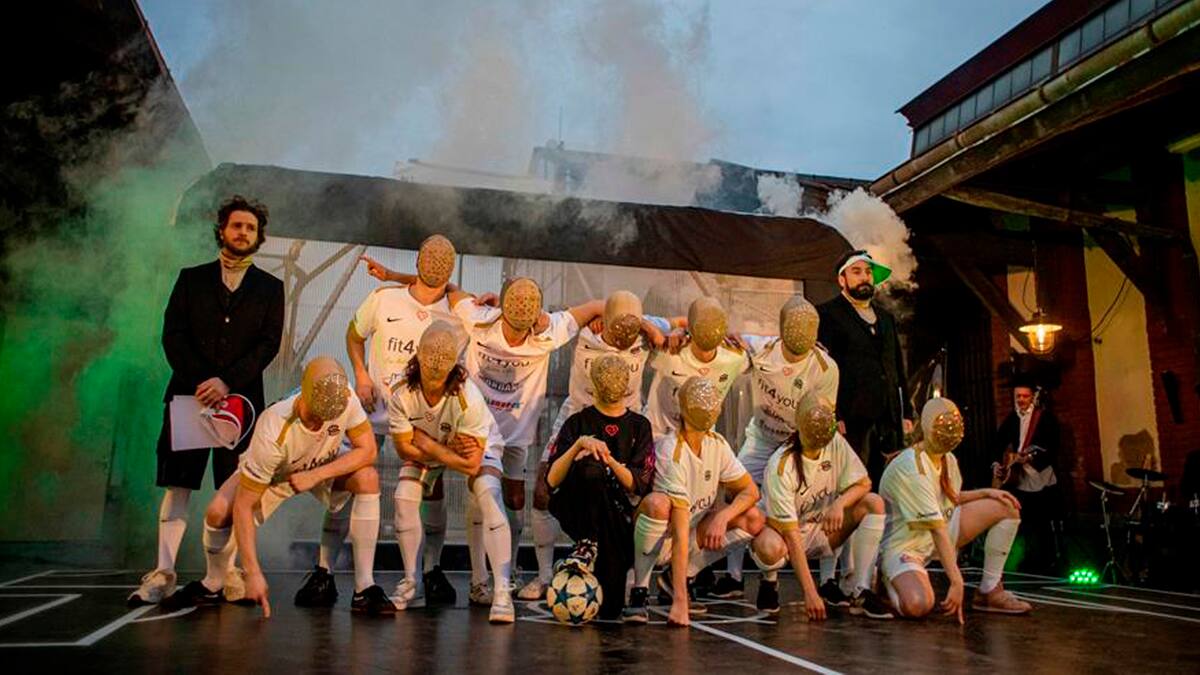 El circo contemporáneo Cirk La Putyka actúa con camisetas de fútbol, reclamando que el Gobierno solo permita público en eventos deportivos.