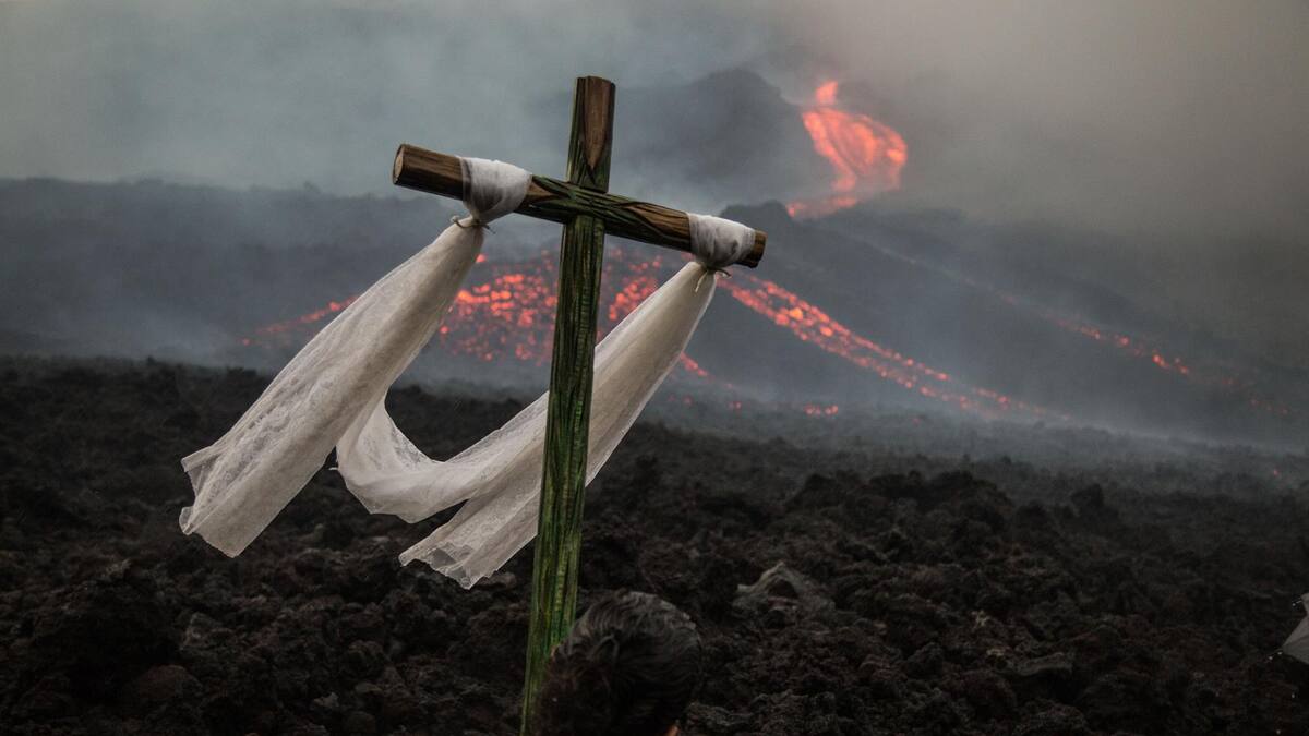 Varias personas oran cerca del volcán en San Vicente Pacaya donde el flujo de lava mantiene su recorrido al oeste con una longitud de 2 mil 100m.