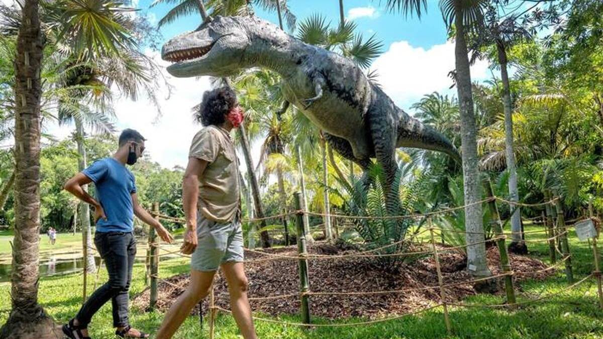 Una veintena de esculturas de tamaño natural de dinosaurios ambientan la "aventura prehistórica" en el Jardín Botánico Fairchild de Miami-Dade.