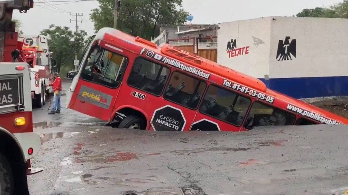 Esto fue lo que le sucedió a un conductor de bus en el estado de Nueva León, en México, cuando el asfalto se abrió dando paso a un enorme hueco de cuatro metros de profundidad y el vehículo cayó dentro.