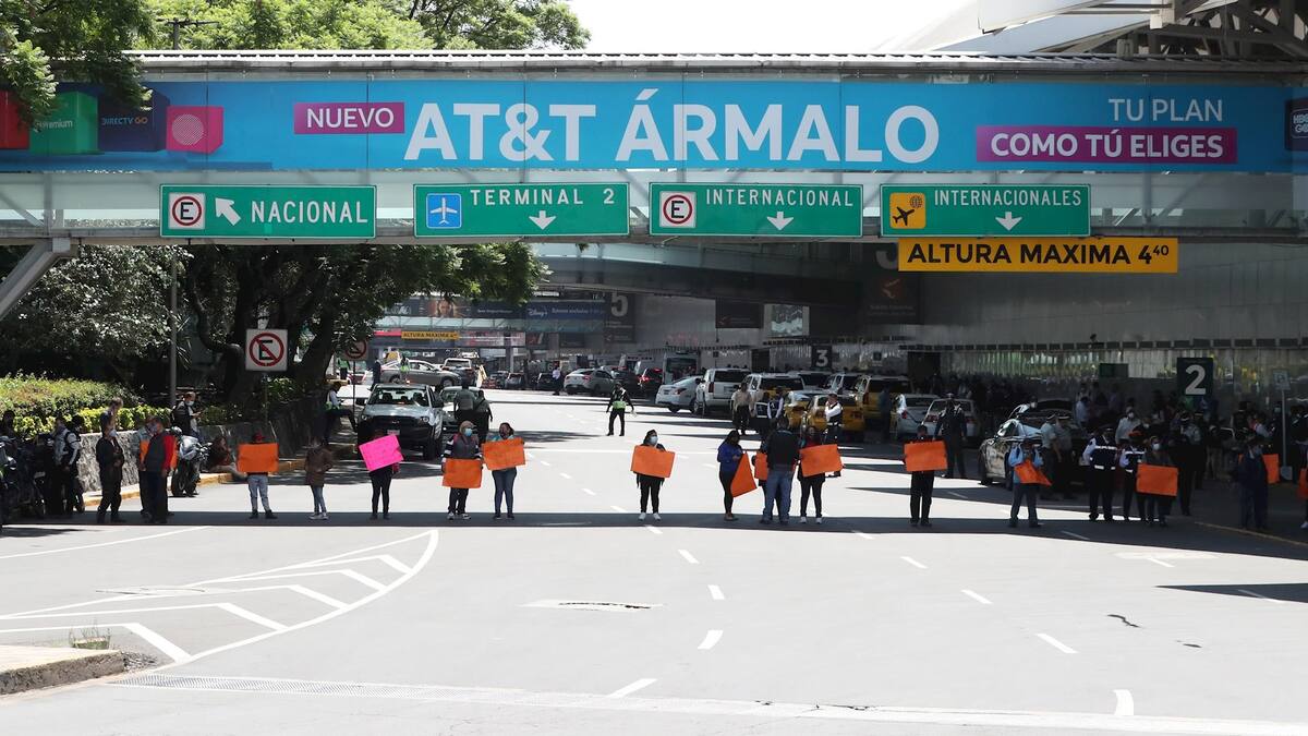 Una veintena de personas cortaron la carretera que lleva a las puertas de la Terminal 1 del aeropuerto sosteniendo pancartas en las que exigen al Gobierno de Andrés Manuel López Obrador garantizar el suministro de medicinas para sus hijos.