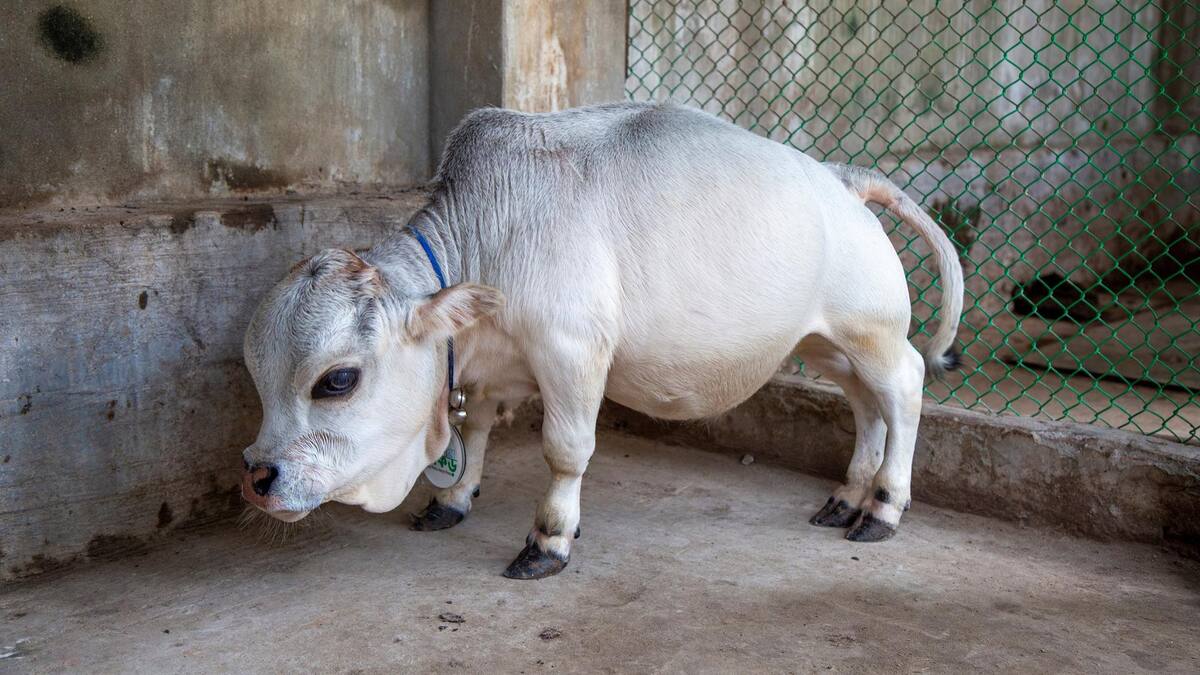 La vaca reposa en una granja de Dhaka, Bangladesh. Tiene 23 meses, mide 26 pulgadas y pesa sólo 57 libras.