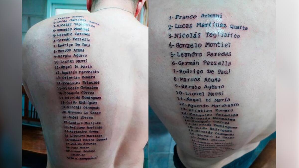 Para este hombre la celebración tenía que ser por lo alto, pues era un acontecimiento que no podía ser olvidado. En homenaje a la victoria, el fanático decidió tatuarse en la espalda el nombre de los 28 jugadores y el del técnico Lionel Scaloni.
