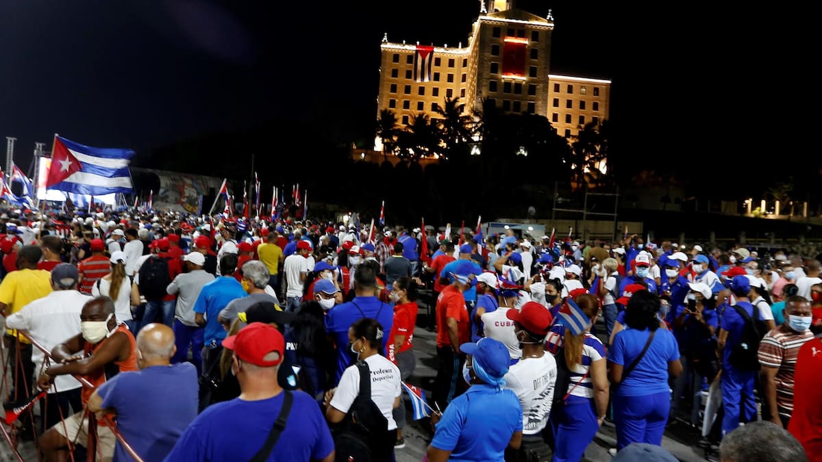 Miles de personas se concentran en La Habana en un acto de apoyo a la Revolución organizado por el Gobierno cubano al que asisten el exmandatario Raúl Castro y el presidente, Miguel Díaz-Canel, casi una semana después de que masivas marchas de protesta sacudieran la isla en medio de una fuerte crisis.