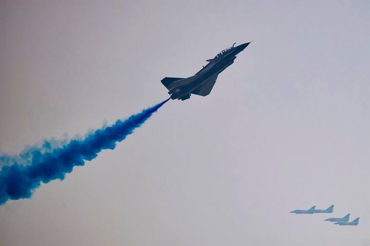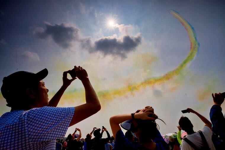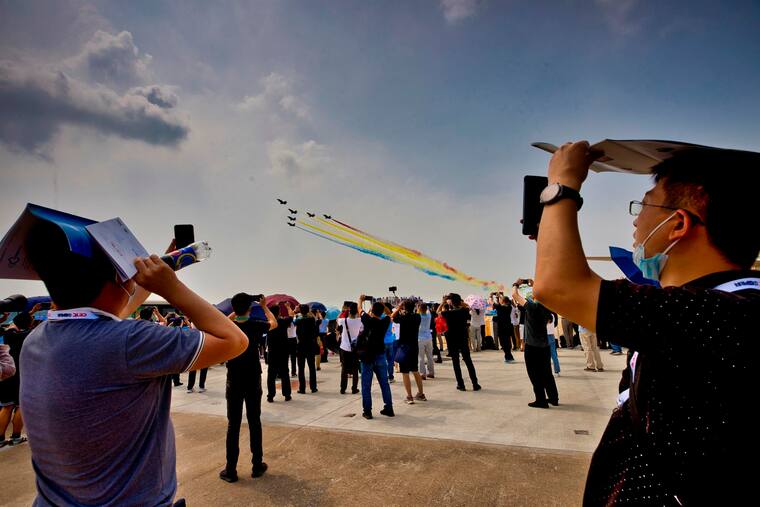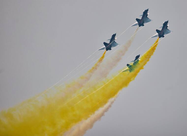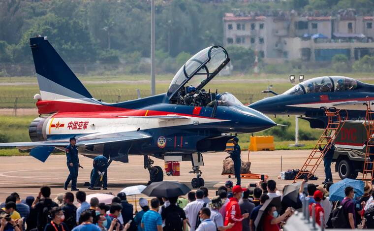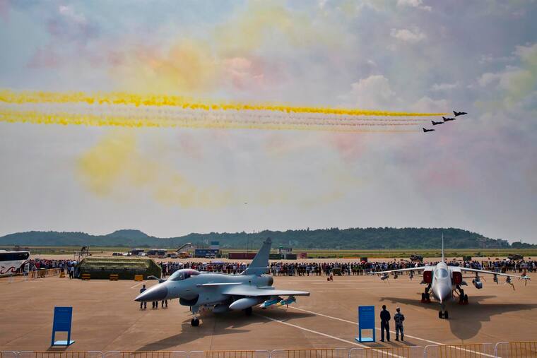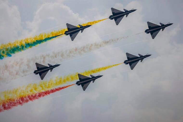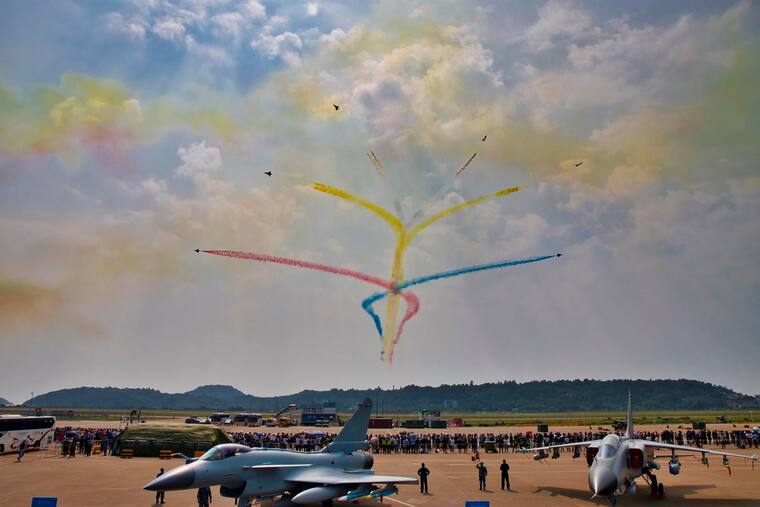 El equipo de acrobacias aéreas "Ba Yi" pilota aviones Chengdu J-10 en Zhuhai, provincia de Guangdong, China