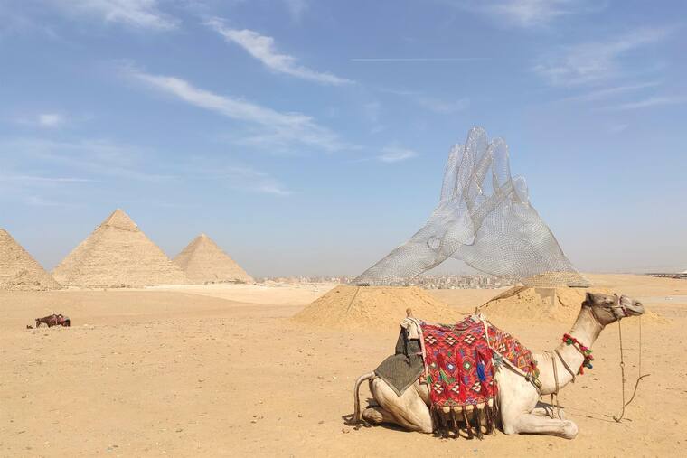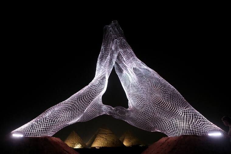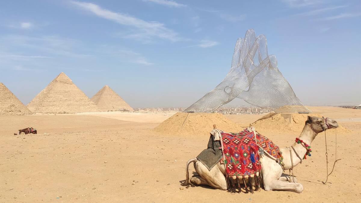 La obra de la egipcia Sherin Guirguis en el marco de la exposición Art D'Egypte en la meseta de las pirámides de Guiza.