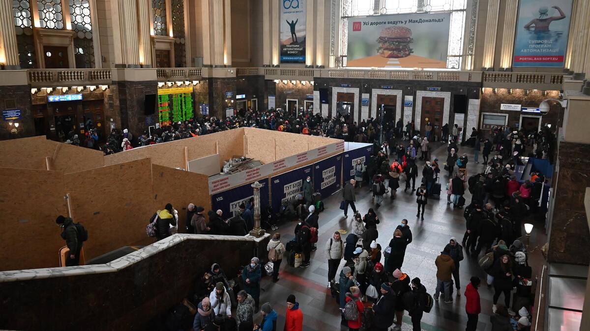 En la estación central de Kiev se percibía angustia. Los pasajeros miraban desesperados al tablón electrónico, ya que los tanques rusos avanzan sin remisión hasta la capital. Todos temen la repentina cancelación de su viaje en tren.
