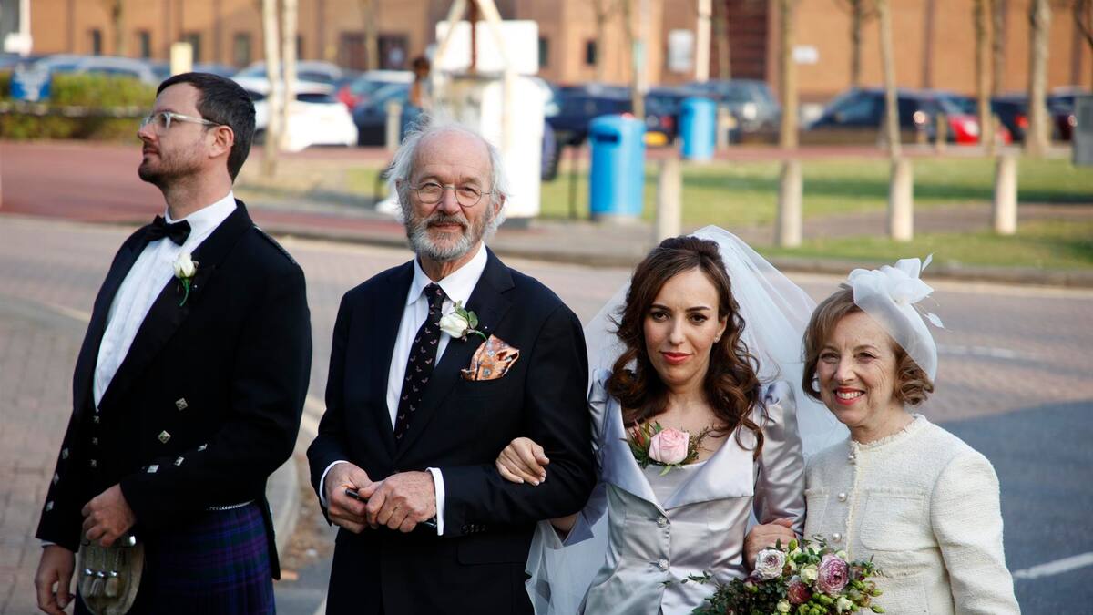 El novio, de 50 años, y los dos hijos de la pareja llevaban faldas escocesas, en honor a los orígenes de la familia del australiano.