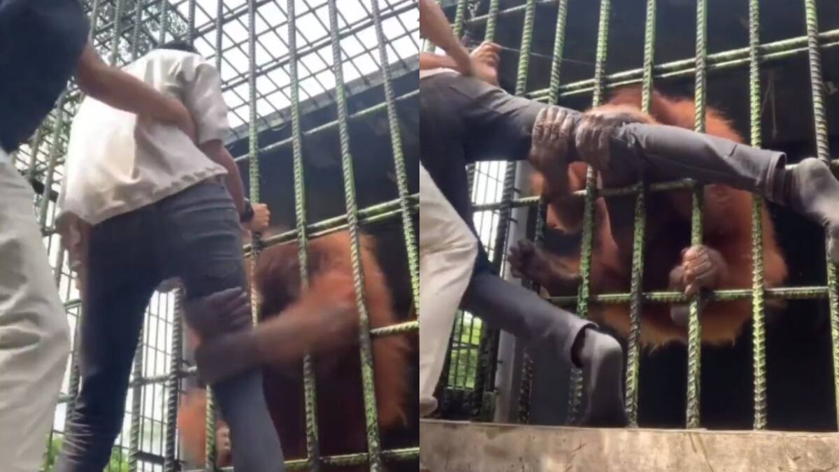 Al ingresar a la zona restringida, el joven estira sus brazos en dirección hacia el orangután y este inmediatamente lo sujeta por la camiseta hasta atraerlo a las rejas.