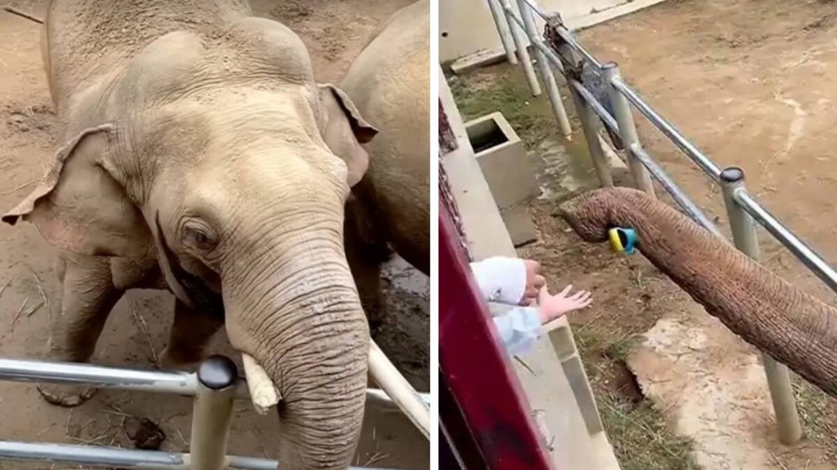 Lo curioso es que este elefante no se lo queda con el objeto, sino que estira su trompara para devolverlo al que sería su dueño.