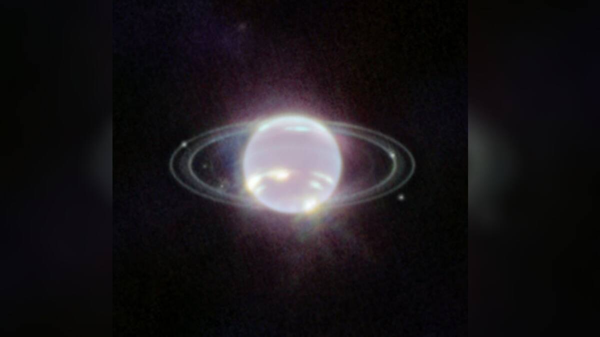 En las imágenes de Webb, gracias a su cámara de infrarrojo cercano Neptuno no aparece azul. Además se observa una fina línea de brillo que rodea el ecuador del planeta, que podría ser una firma visual de la circulación atmosférica global que impulsa los vientos y las tormentas del planeta.