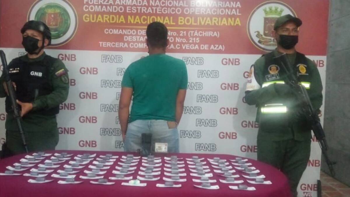 Miembros de la Fuerza Armada Nacional Bolivariana (FANB) de Venezuela detuvieron a un hombre en el estado venezolano de Táchira (fronterizo con Colombia) por el tráfico de 1 kilo con 100 gramos de cocaína, informaron este lunes autoridades militares.