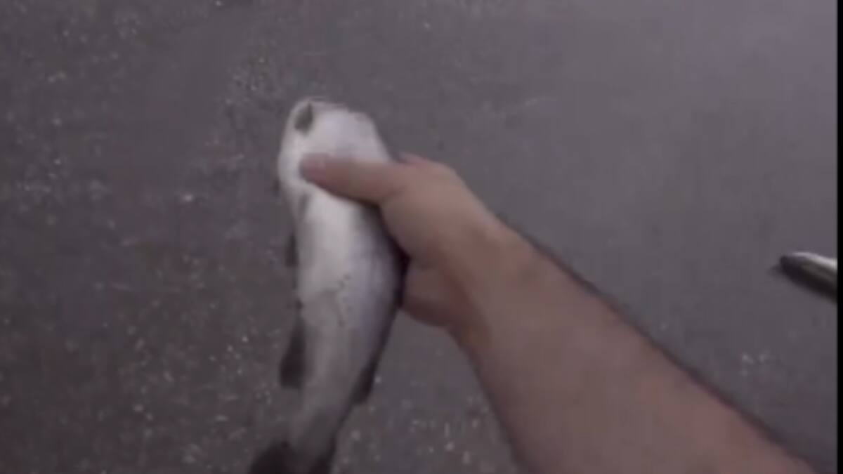 En el clip audiovisual se ve a las personas saliendo de sus vehículos y casas para coger a los peces vivos que caían del cielo.