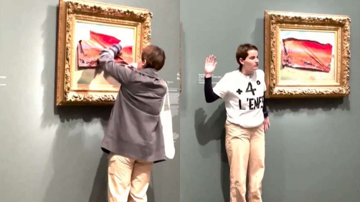 Esa acción es visible en un vídeo colgado en la cuenta de X de la ONG Respuesta Alimentaria, en la que la militante llega junto a la obra de Monet y pega encima una imagen con tonos rojos mientras pone a la vista la camiseta que lleva en la que se puede leer '+4º, el infierno'.