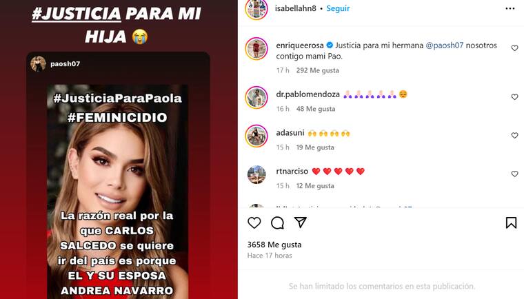 En sus redes sociales, María Isabel Hernández Navarro publicó una imagen en la que vincula el crimen de Paola Salcedo con su hermano Carlos Salcedo Jr.