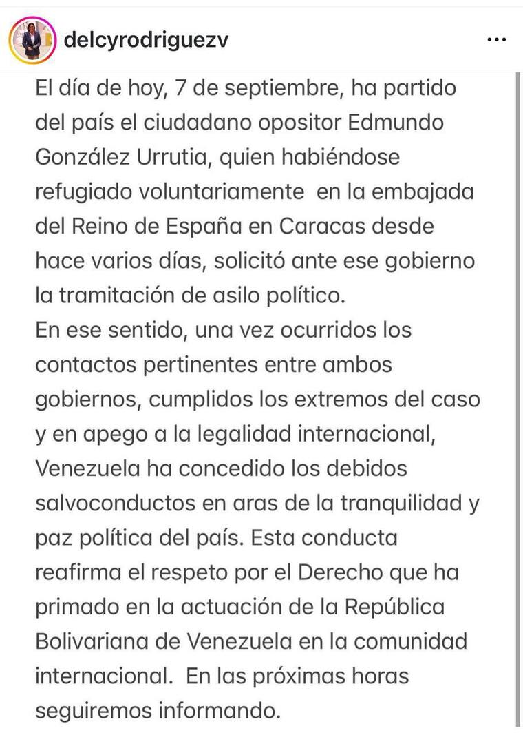 'El día de hoy, 7 de septiembre, ha partido del país el ciudadano opositor Edmundo González Urrutia, quien habiéndose refugiado voluntariamente en la embajada del Reino de España en Caracas desde hace varios días, solicitó ante ese gobierno la tramitación de asilo político', indicó Rodríguez en su cuenta de Instagram.
