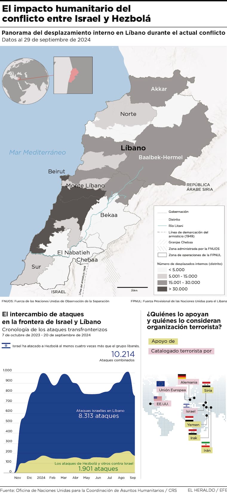 Desde ese día, la inminente respuesta de Israel se hizo sentir en el sur del Líbano, que se ha convertido en el campo de batalla para enfrentar a la milicia de Hezbolá, que luego de perder a su máximo líder sufrió un golpe moral significativo y ha venido resistiendo, al tiempo que asestando su propia ofensiva contra el Ejército israelí respaldados por el máximo líder iraní, el ayatolá Alí Jamaneí.