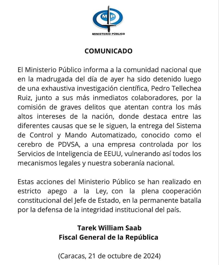 El ente fiscal explicó que entre “las diferentes causas que se le siguen” a Tellechea figura la “entrega del Sistema de Control y Mando Automatizado, conocido como el cerebro de PDVSA, a una empresa controlada por los Servicios de inteligencia de EE. UU., vulnerando así todos los mecanismos legales” de la soberanía de Venezuela.
