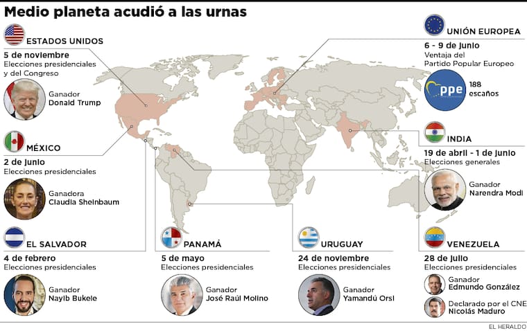 Fueron 76 países los que tuvieron elecciones, por lo que medio planeta acudió a las urnas, siendo el año marcado por la lucha por proteger la democracia. Unos treinta países eligieron a su gobernante, entre ellos El Salvador, México, Panamá, República Dominicana, Uruguay, Estados Unidos y Venezuela, estos dos últimos fueron claves este 2024.