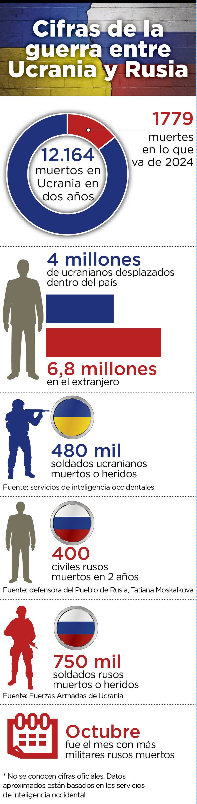 Este año, la guerra cumplió 1.000 días dejando más de 12 mil víctimas mortales en Ucrania, más de 3.400 escuelas y hospitales dañados o destruidos y 10 millones de personas han huido de sus hogares. Para Ramírez, hubo un estancamiento en el conflicto. “Ucrania lo que hizo fue expandir el territorio pero sin lograr avances significativos en cualquiera de los bandos. Tampoco logró consolidar esas supuestas ayudas que estaban llegando y se le fue agotando el tiempo a Zelenski frente a la administración de Biden (...) se involucran cada vez más países, pero a la final una resolución del conflicto no se ve para 2025″.