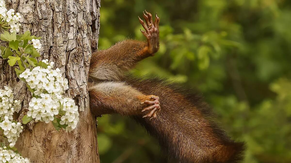 El fotógrafo italiano Miko Marchetti se coronó como ganador del Premio de Fotografía en la categoría de Mamíferos en los prestigiosos Comedy Wildlife Photography Awards 2024. Su obra, titulada Stuck Squirrel (Ardilla Atrapada), capturó un momento único y divertido en el que una ardilla roja se introduce en un árbol, mientras sus patas forman un ángulo recto, evidenciando la destreza y agilidad del animal en su comportamiento natural.