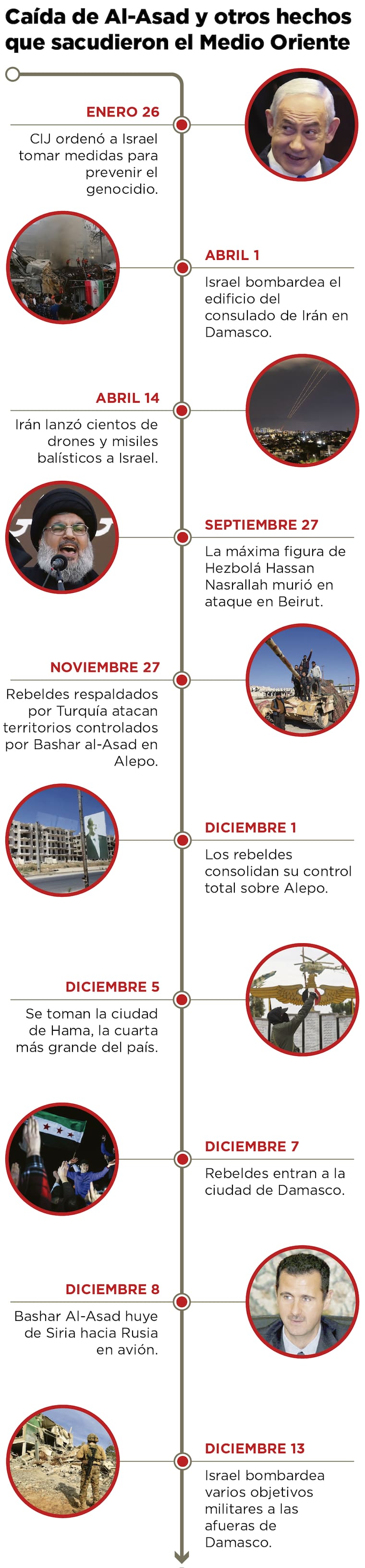 “Pero el régimen estaba más débil de lo que se pensaba y viendo la situación que se está desarrollando en todo Oriente Medio, no había muchas más opciones para mantenerse en el poder. La fuerza de Al Asad eran sus aliados, pero todos están muy debilitados, Rusia, Irán, Hezbolá... No había recursos”, dijo.