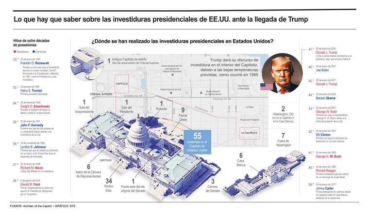 Debido a la ola de frío que azota la capital, Trump tomó la decisión de última hora de celebrar su segunda investidura al interior del Congreso, en la Rotonda del Capitolio, mismo lugar donde Reagan juró en 1985 el cargo para su segundo mandato, también por el frío.