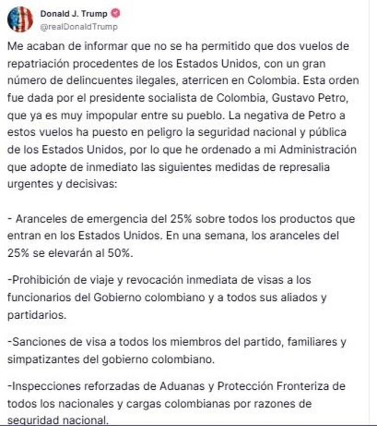 Agregó que “la negativa de Petro a estos vuelos ha puesto en peligro la Seguridad Nacional y la Seguridad Pública de los Estados Unidos, por lo que he ordenado a mi Administración que tome de inmediato medidas de represalia urgentes y decisivas”.