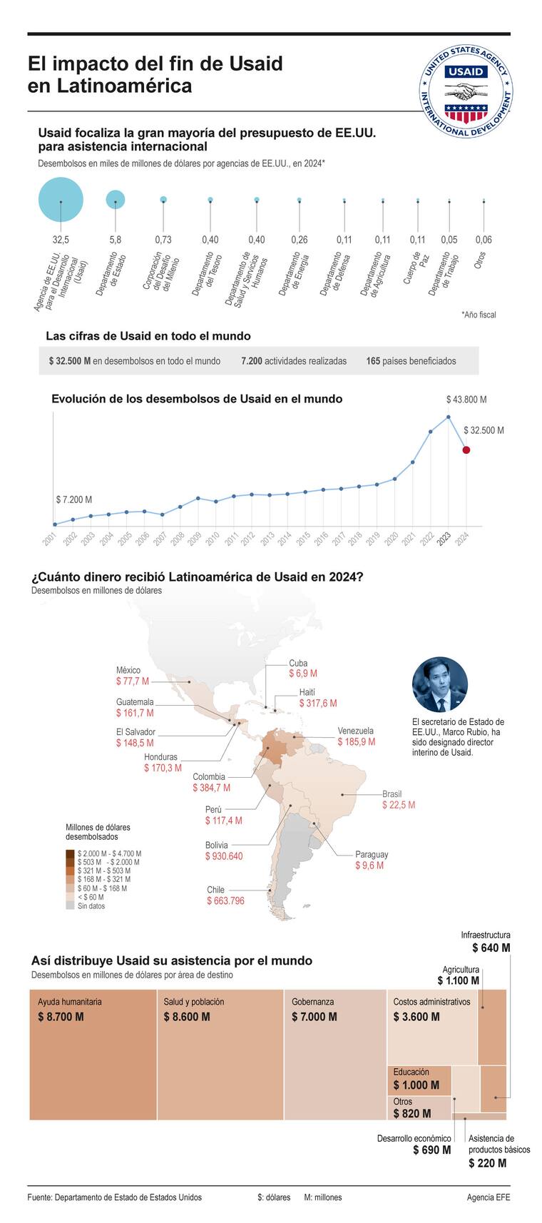 América Latina enfrentará las consecuencias de la suspensión de los fondos y el recorte de la Agencia de los Estados Unidos para el Desarrollo Internacional (Usaid), que en 2024 aportó a la región 2.300 millones de dólares, una decisión adoptada por el presidente Donald Trump, que amenaza la continuidad de los programas en 130 países y perjudicará a millones de personas que hasta ahora se beneficiaban de la cooperación estadounidense.